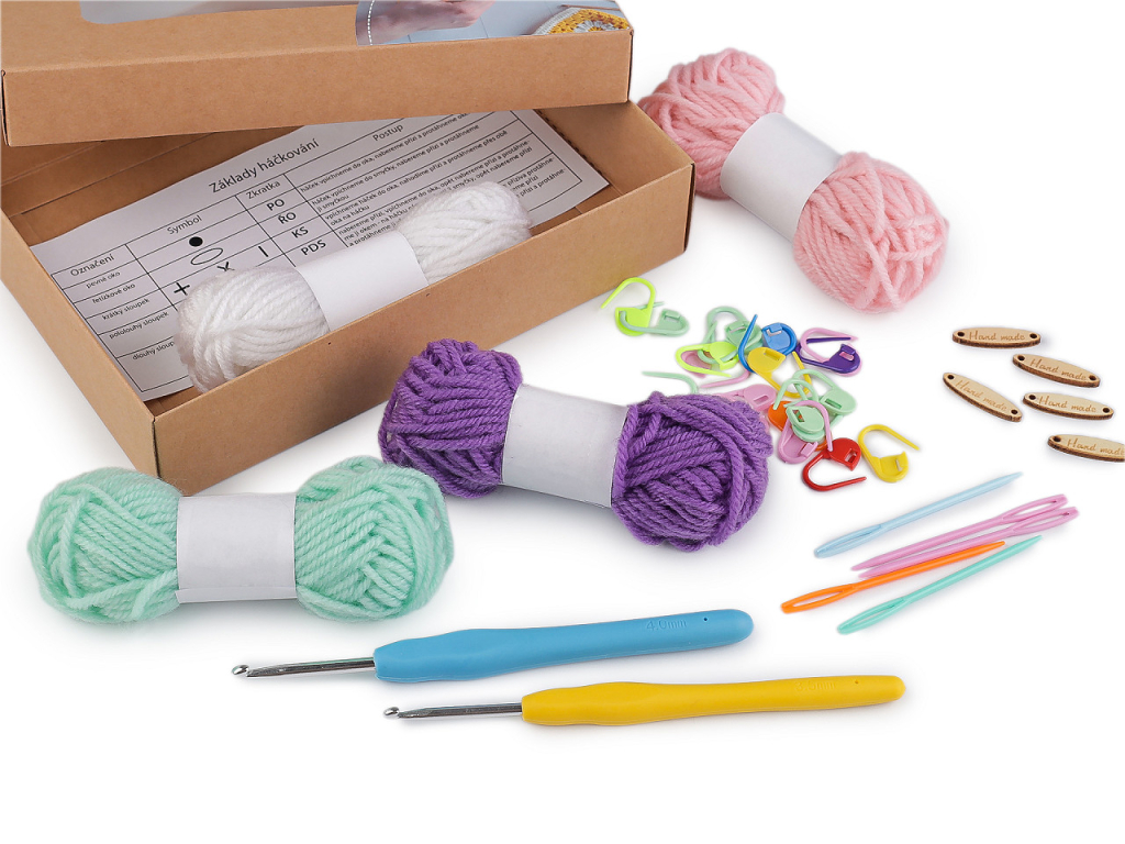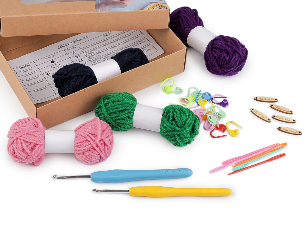 V balení nájdete 2 háčiky vo veľkosti 3,5 a 4 mm, plastové ihly (5 ks), plastové spínacie špendlíky (20 ks), drevené ceduľky "Hand made" (5 ks), priadza (4 ks) a návod na základy háčkovania. Farby priadzí sa môžu líšiť.